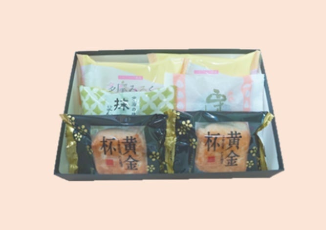 人気の黄金杯・栗ひとつぶ・抹茶饅頭・多摩みるくを入れた詰め合わせです。
